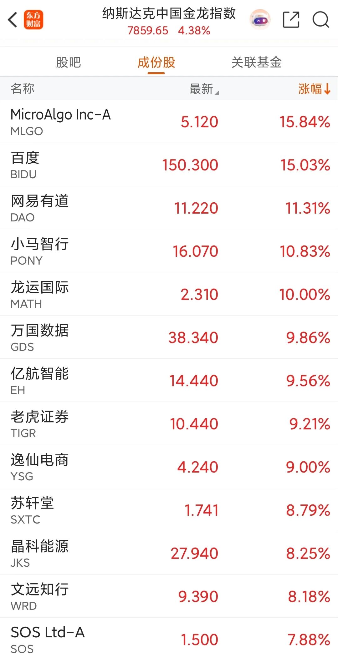 热门中概股普涨,纳斯达克中国金龙指数收涨4.38%,百度大涨超15%,哔哩哔哩、网易涨超7%,阿里巴巴涨超6%,京东涨近3%。